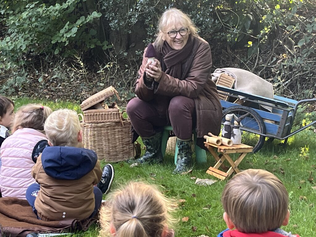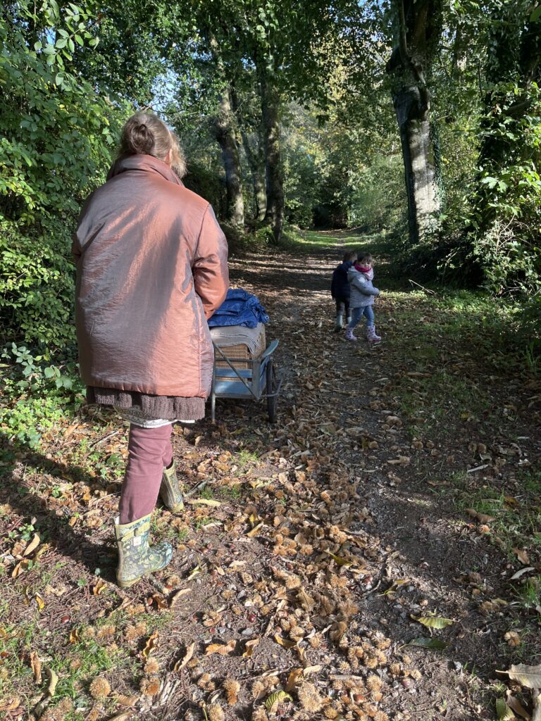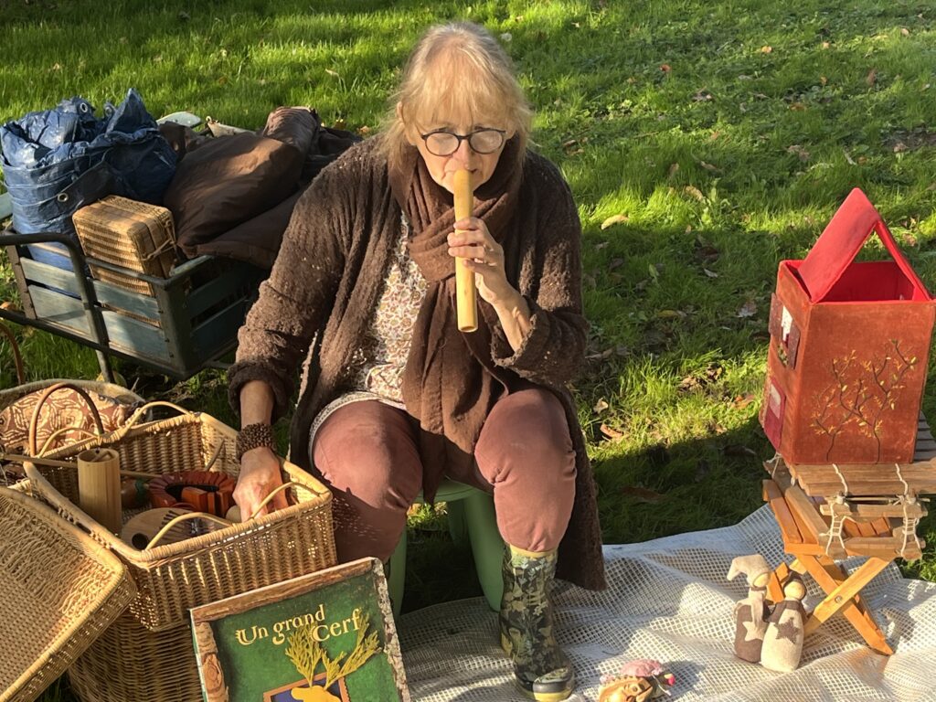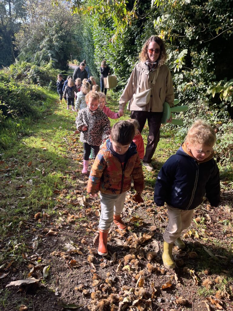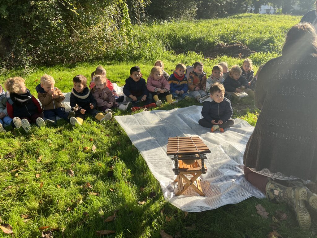 Christine, conteuse de « A fleur de mot » nous a proposé une balade contée sur le thème de l’automne. Nous avons marché dans les petits chemins recouverts de feuilles. De temps en temps, nous nous arrêtions pour écouter de belles histoires accompagnées d’instruments de musique, de comptines, de chansons. Christine nous a conté « La petite feuille qui voulait voyager, « le chapeau de la sorcière » et « la grosse pomme de rainette ». Merci pour ces belles découvertes !