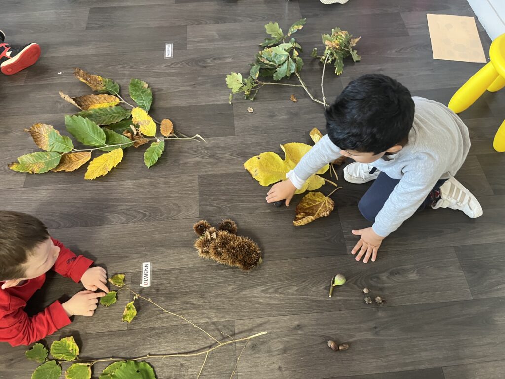 Nous avons remarqué que les feuilles avaient une forme différente selon les arbres, et que nous pouvions les reconnaître (même sans les fruits). Nous avons plus particulièrement travaillé autour du chêne, avec le vocabulaire du gland et le cycle de vie du chêne.