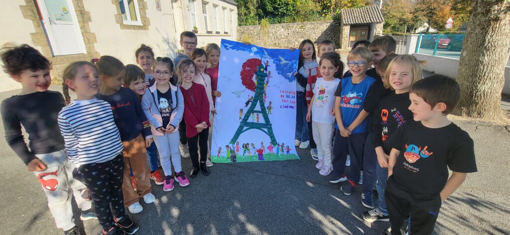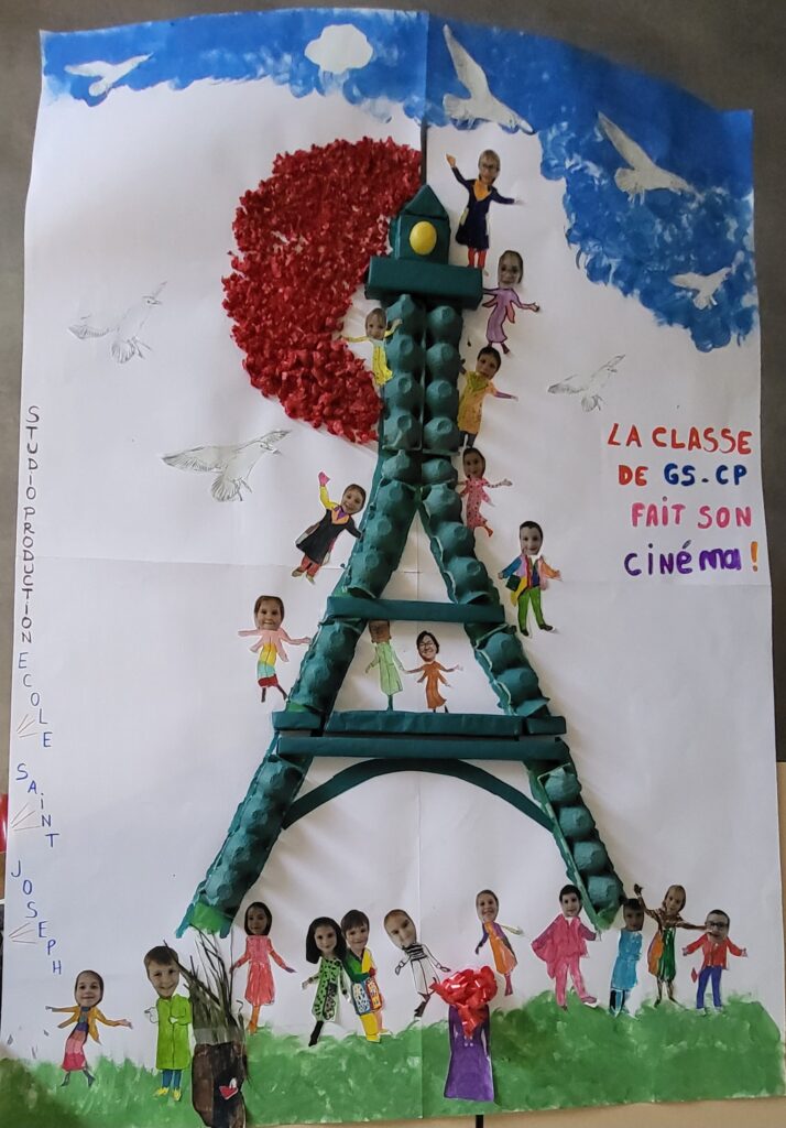 En lien avec le festival Alain Resnais de Treffléan, les élèves de GS-CP ont réalisé une affiche. Tout au long de cette première période, les GS-CP ont travaillé sur cinq affiches de film d’Alain Resnais et ont retenu un élément qu’ils ont reproduit à leur manière afin de créer leur propre affiche. Cette affiche est exposée à la médiathèque. Silence, on tourne.