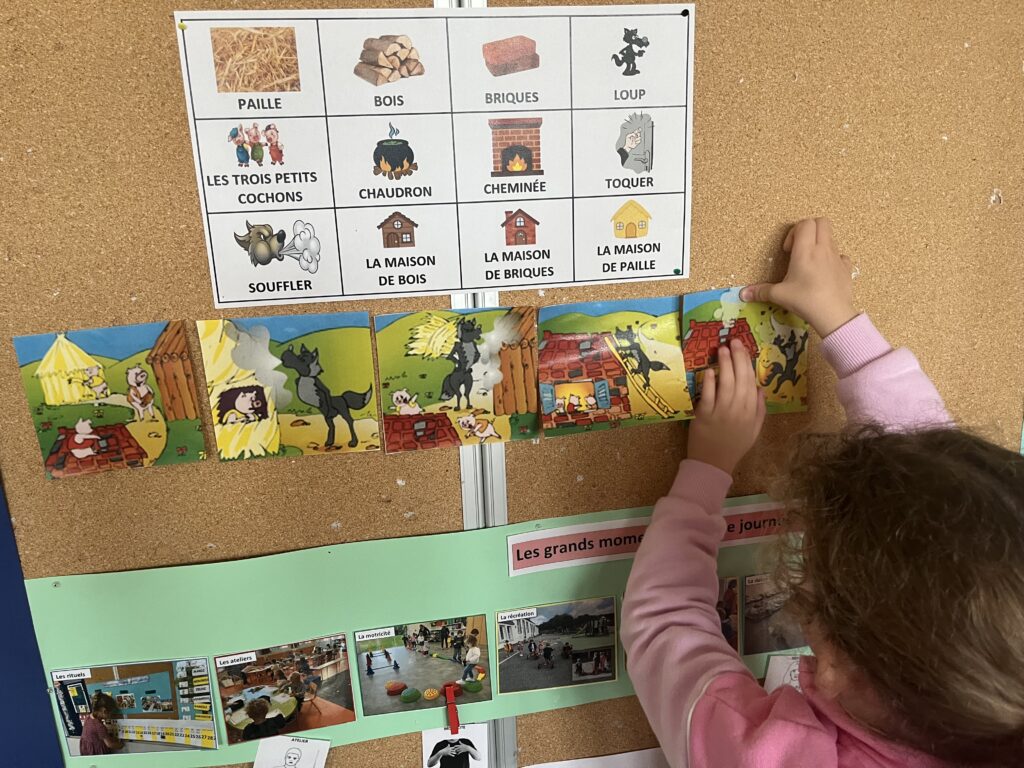 En lien avec notre projet d’année autour des contes, nous avons découvert l’histoire « Les trois petits cochons ».
