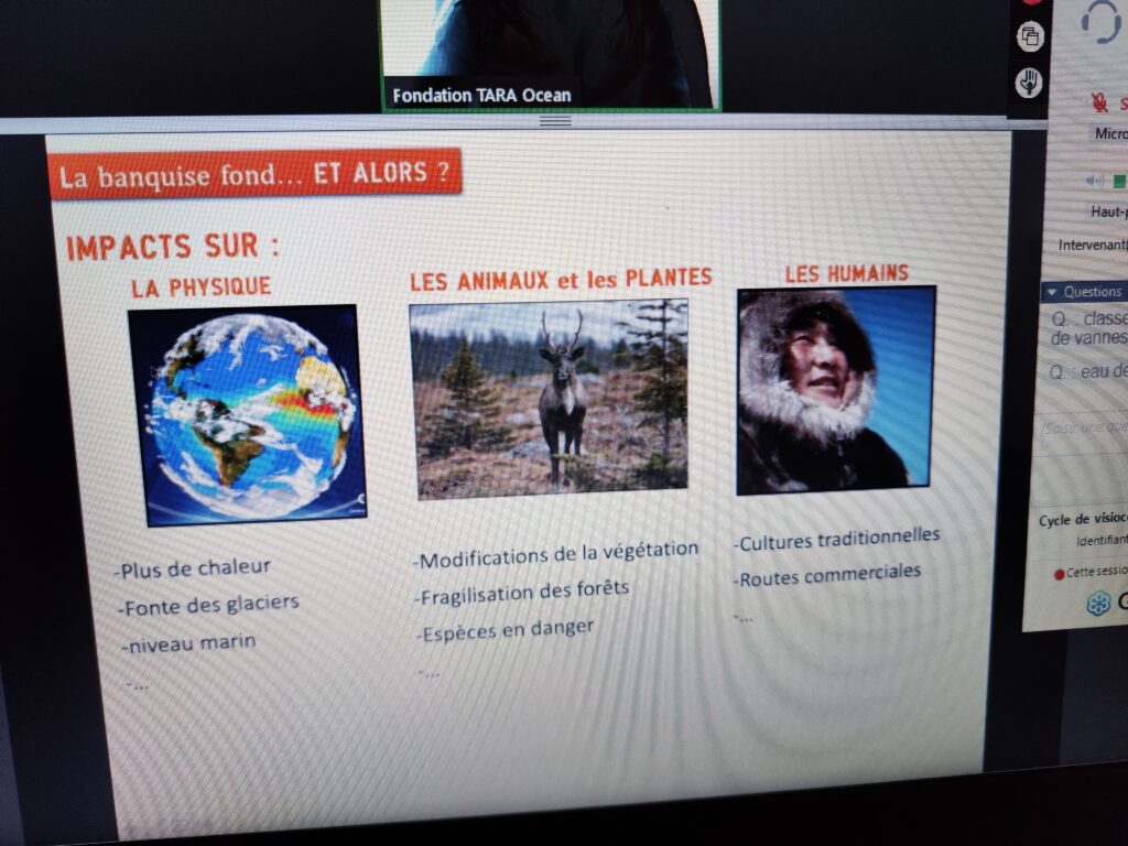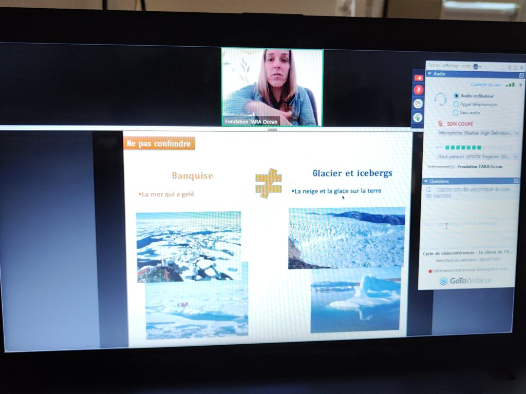 Nous nous sommes inscrits pour une visio conférence sur le thème du climat de l’arctique. Des classes de toute la France et du monde participaient. Une scientifique nous a parlé du climat (icebergs, banquise, fonte des glaces, réchauffement). Elle nous a présenté les bateaux qui vont étudier les espèces, les transformations… Un nouveau bateau partira de Lorient le 19 juillet.